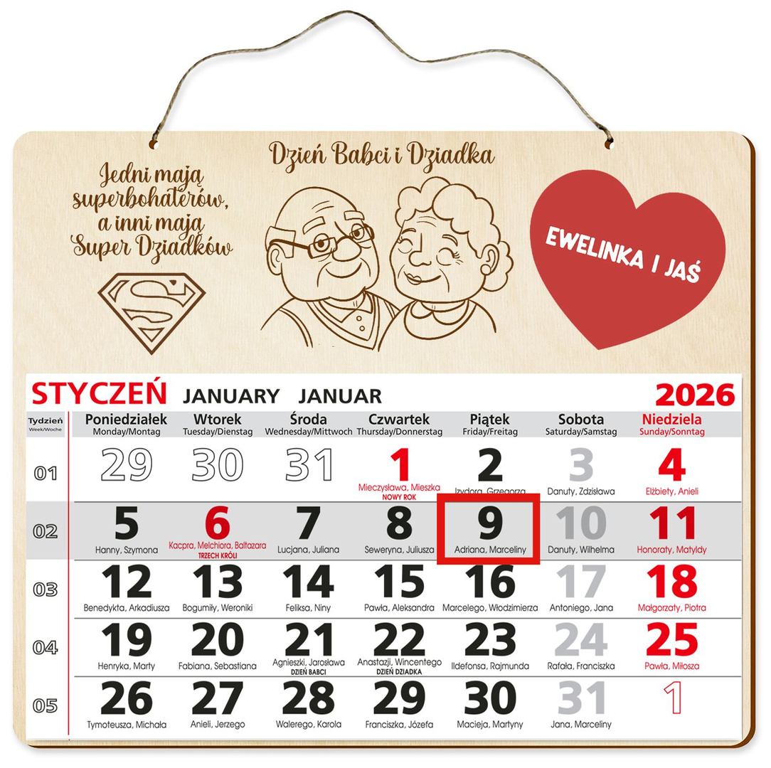 DREWNIANY KALENDARZ na 2026 rok prezent na Dzień Babci i Dziadka + własna dedykacja + sznurek jutowy