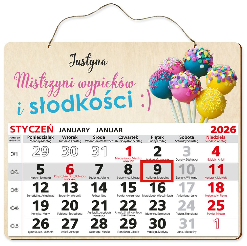 DREWNIANY KALENDARZ na 2026 rok + własna dedykacja + sznurek