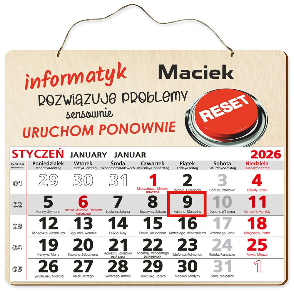 DREWNIANY KALENDARZ na 2026 rok + własna dedykacja + sznurek jutowy