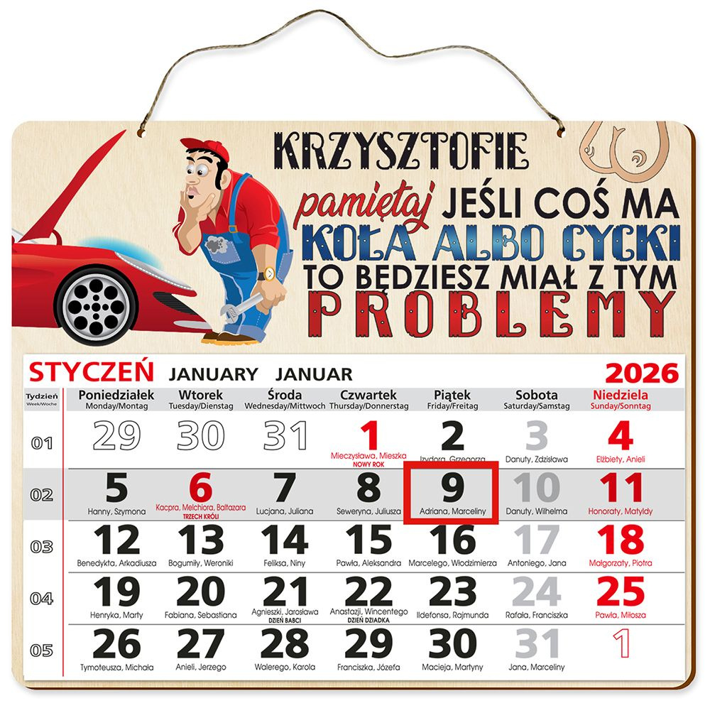 DREWNIANY KALENDARZ na 2026 rok + własna dedykacja + sznurek jutowy