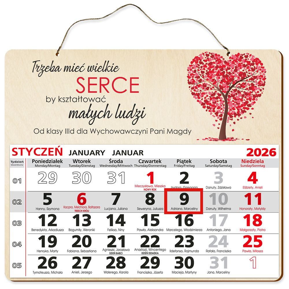 DREWNIANY KALENDARZ na 2026 rok + własna dedykacja + sznurek jutowy