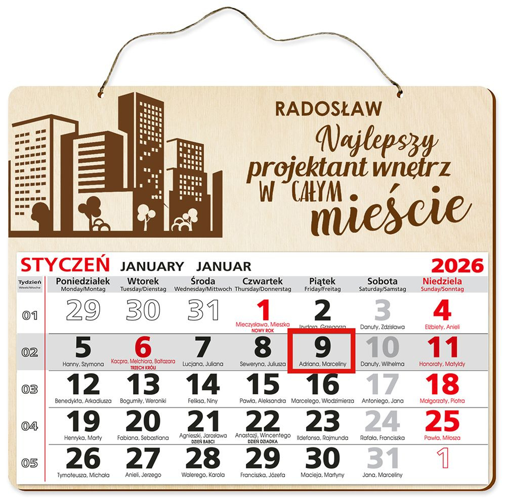 DREWNIANY KALENDARZ na 2026 rok + własna dedykacja + sznurek jutowy