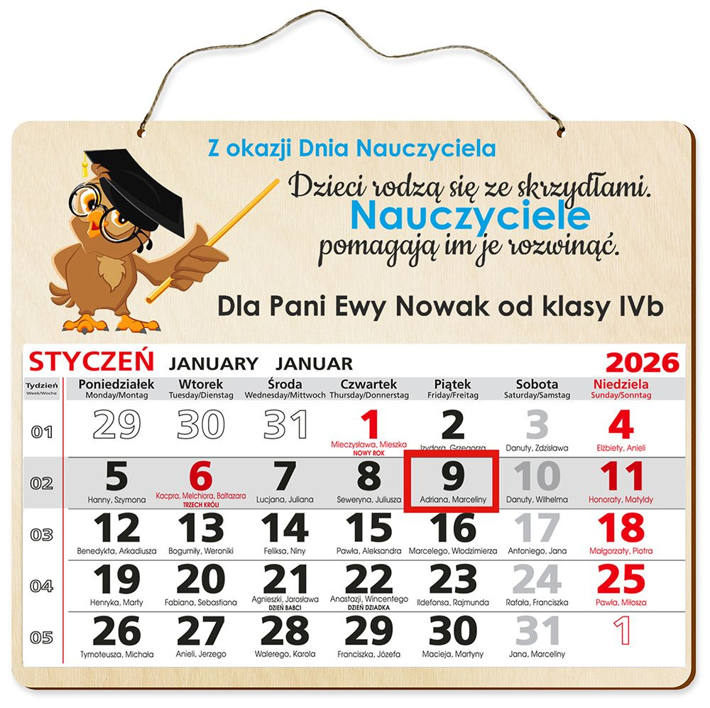 DREWNIANY KALENDARZ na 2026 rok prezent na Dzień Nauczyciela + własna dedykacja + sznurek jutowy