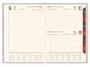 Kalendarz wyróżnia się przede wszystkim wytrzymałą skórzaną okładką w kolorze czerwonym.