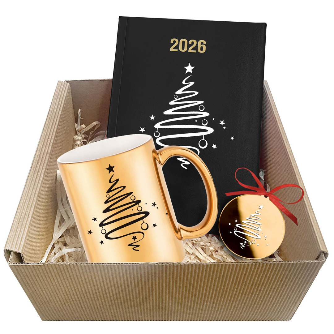 Zestaw prezentowy LUSTRZANY ZŁOTY KUBEK + KALENDARZ KSIĄŻKOWY DZIENNY A5 na 2026 rok + ZŁOTA LUSTRZNA BOMBKA NA CHOINKĘ + opakowanie prezentowe + czerwone wstążki