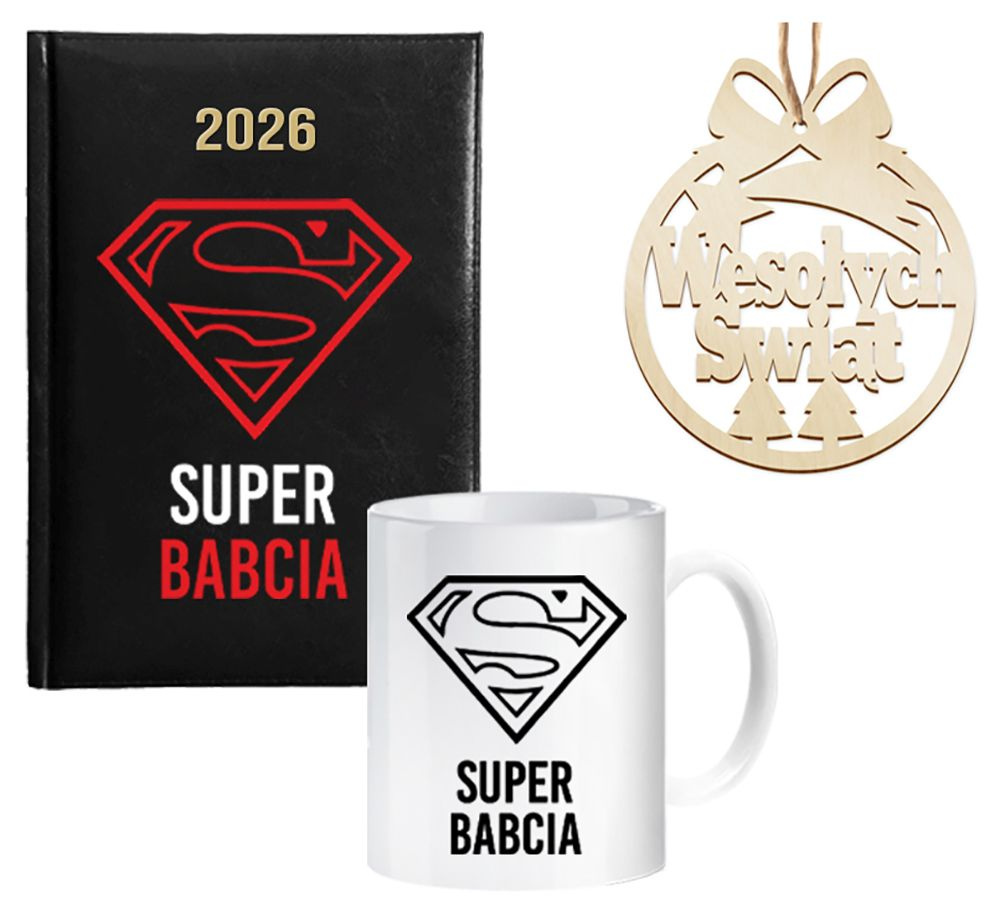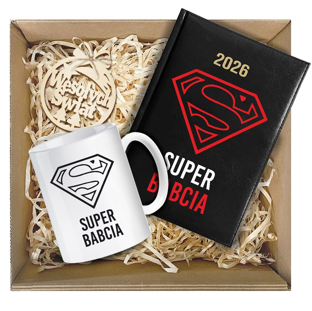 Zestaw prezentowy DLA BABCI KUBEK + KALENDARZ KSIĄŻKOWY DZIENNY A5 na 2026 rok + BOMBKA NA CHOINKĘ + opakowanie prezentowe + sznurek jutowy + czerwona wstążka
