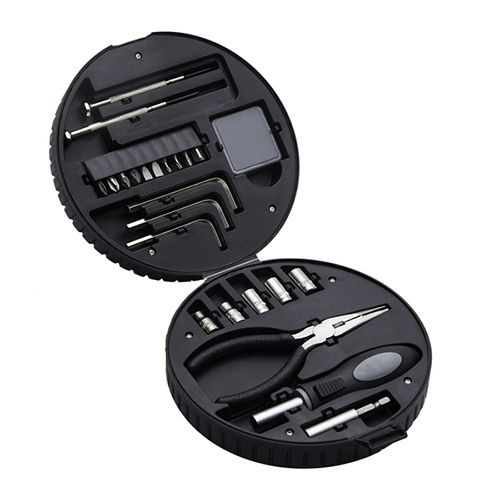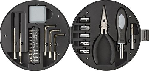 Cały zestaw składa się z 25 różnych elementów, które umieszczone są w solidnym organizerze narzędziowym w kształcie opony