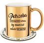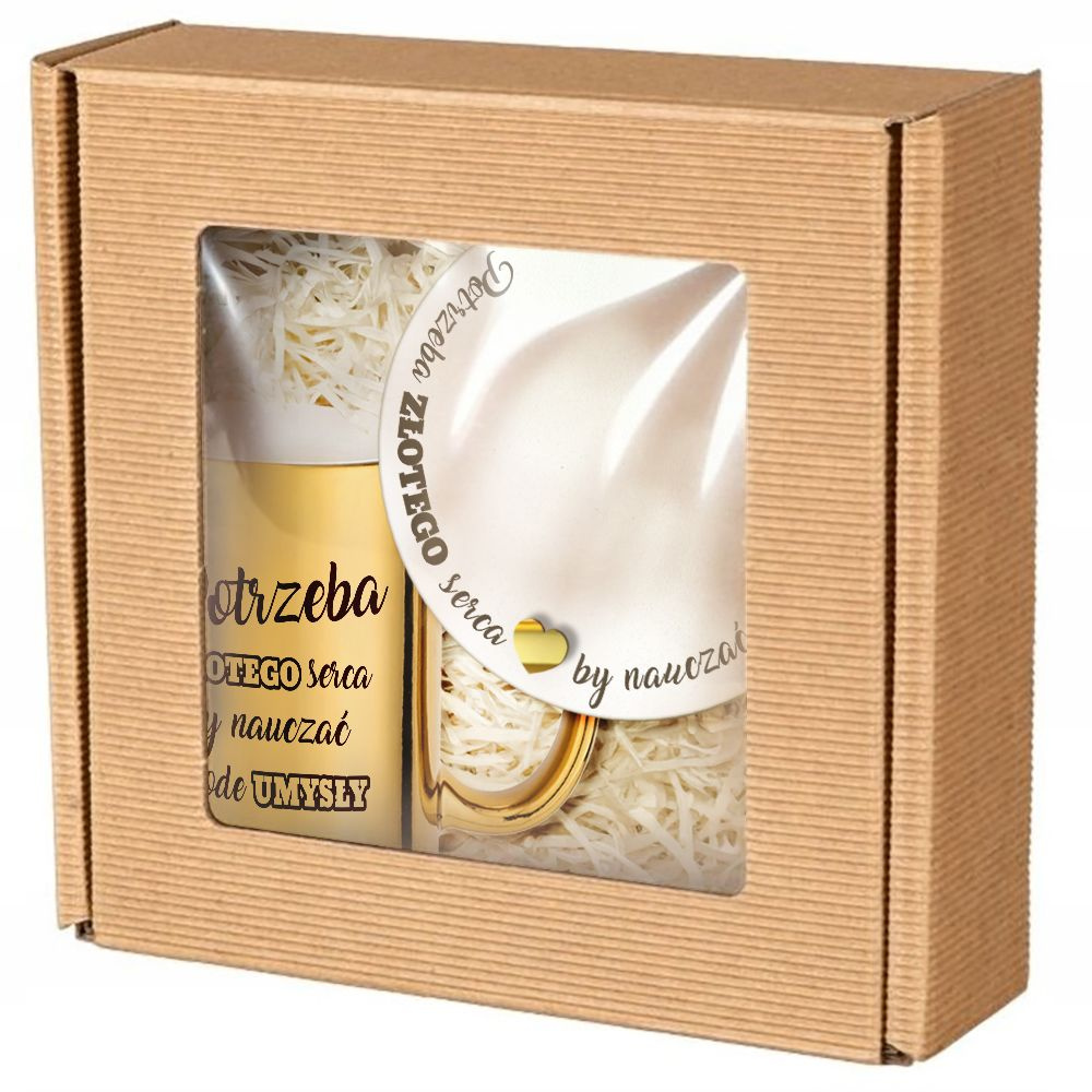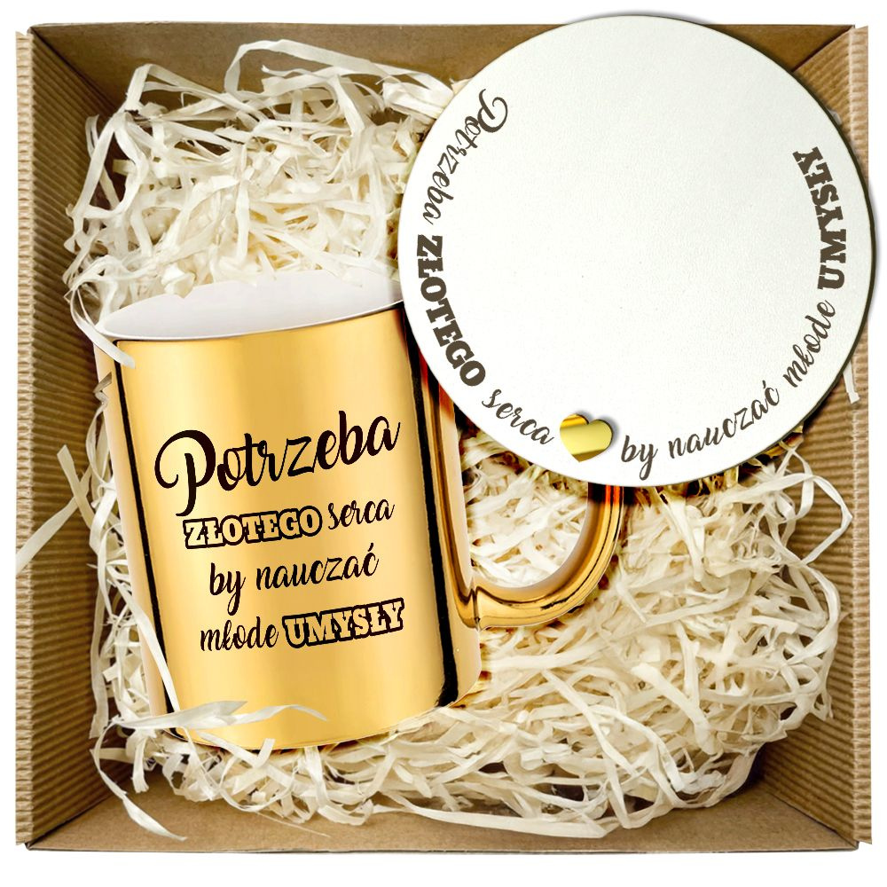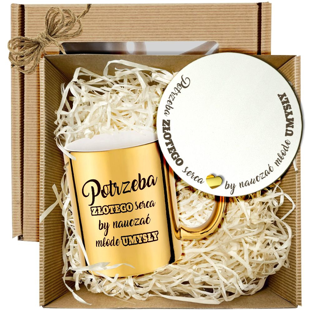Zestaw prezentowy DLA NAUCZYCIELA / WYCHOWAWCY ZŁOTY KUBEK Z PODSTAWKĄ Z OZDOBNYM OPAKOWANIEM I SZNURKIEM JUTOWYM