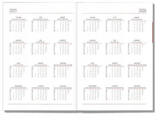 • kalendarz: książkowy, dzienny, 352 strony na rok 2025/2026