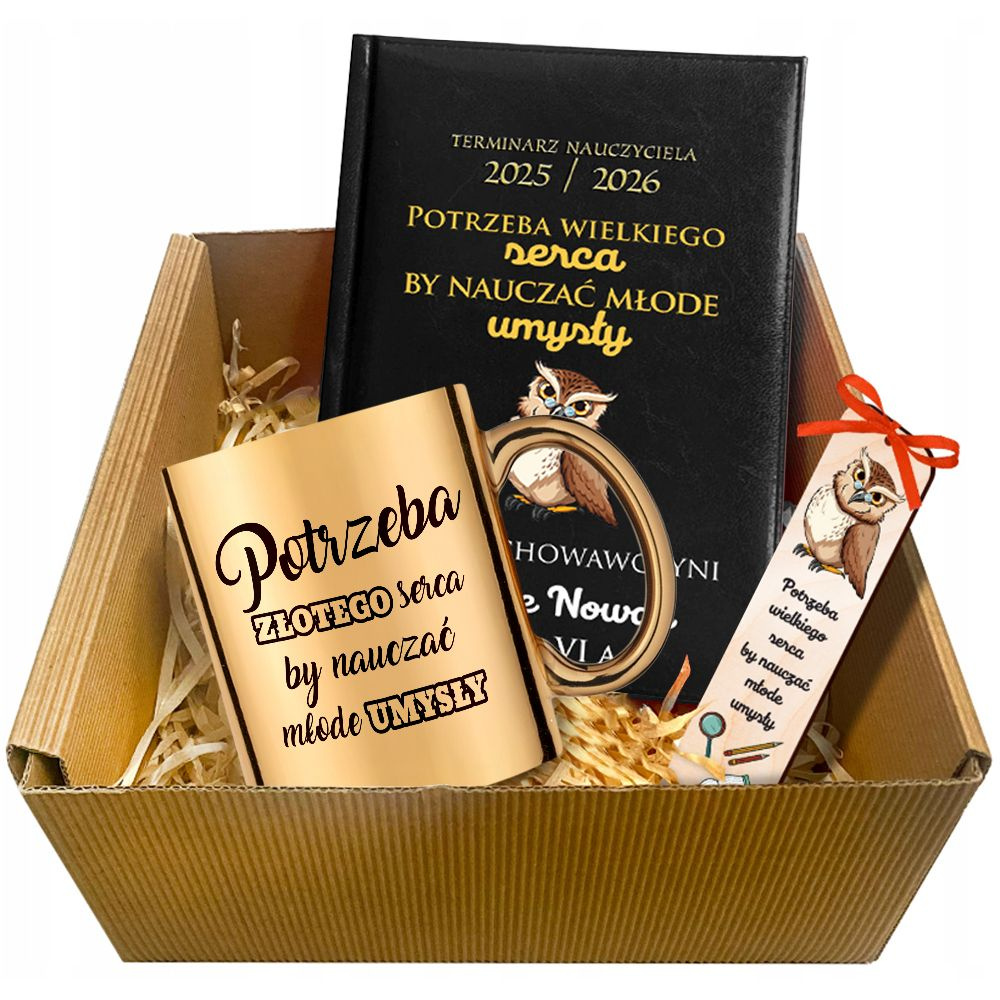 Zestaw prezentowy DLA NAUCZYCIELA ZŁOTY KUBEK + KALENDARZ KSIĄŻKOWY DZIENNY A5 + ZAKŁADKA Z OZDOBNYM OPAKOWANIEM