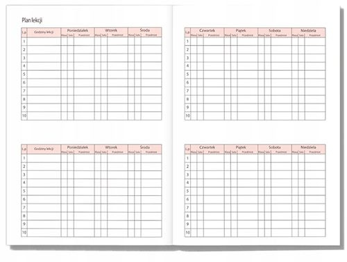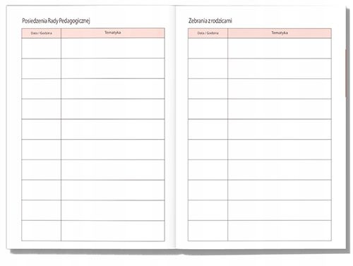 • rozkład roku szkolnego, plan lekcji, tabele ocen i frekwencji, wykaz ważnych kontaktów, zestawienie spotkań z rodzicami.