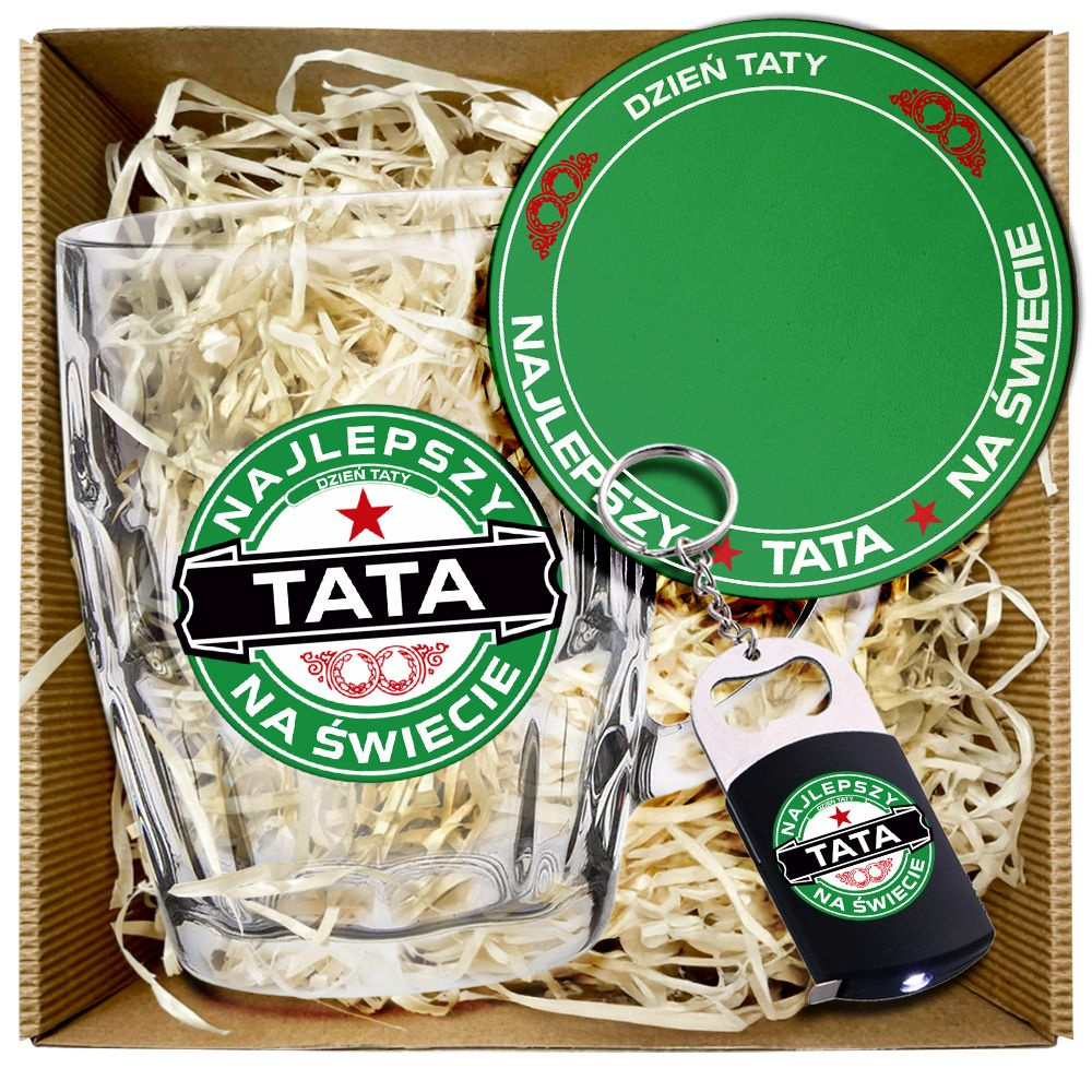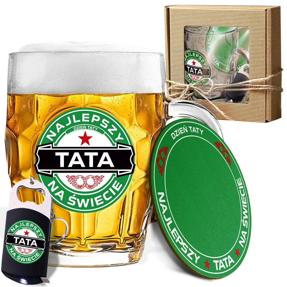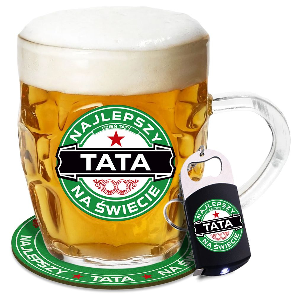 Zestaw do Piwa z Nadrukiem dla Taty – Kufel + podkładka + 3w1 brelok z miarką, otwieraczem i latarką
