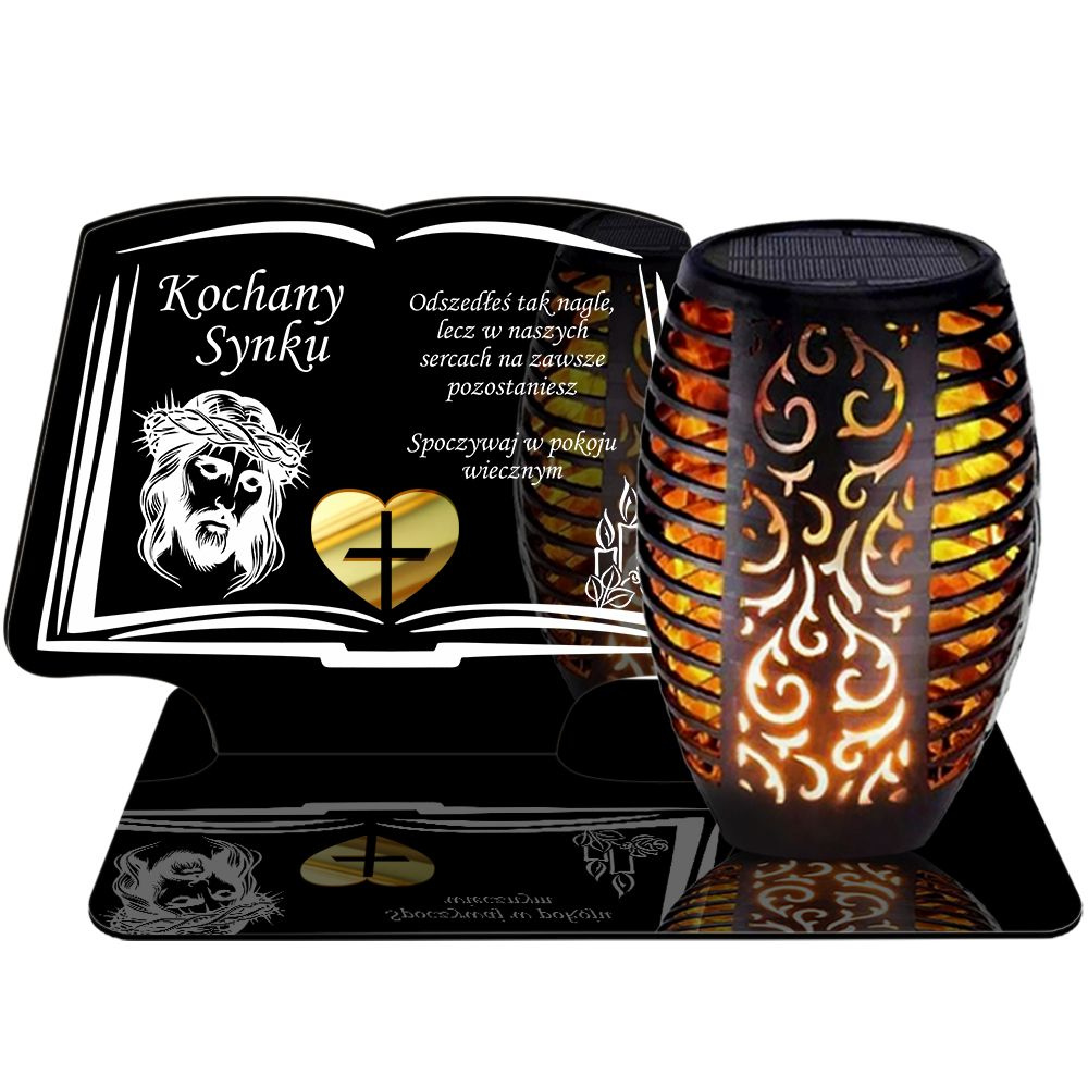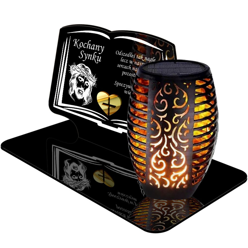 ZNICZ SOLARNY LED WIECZNY PODSTAWKA NA CMENTARZ GRÓB Księga EFEKT PŁOMIENIA DLA SYNA