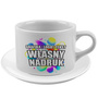 Biała filiżanka z talerzykiem, z własnym nadrukiem – zdjęcie, logo, tekst, grafika, logo firmowe