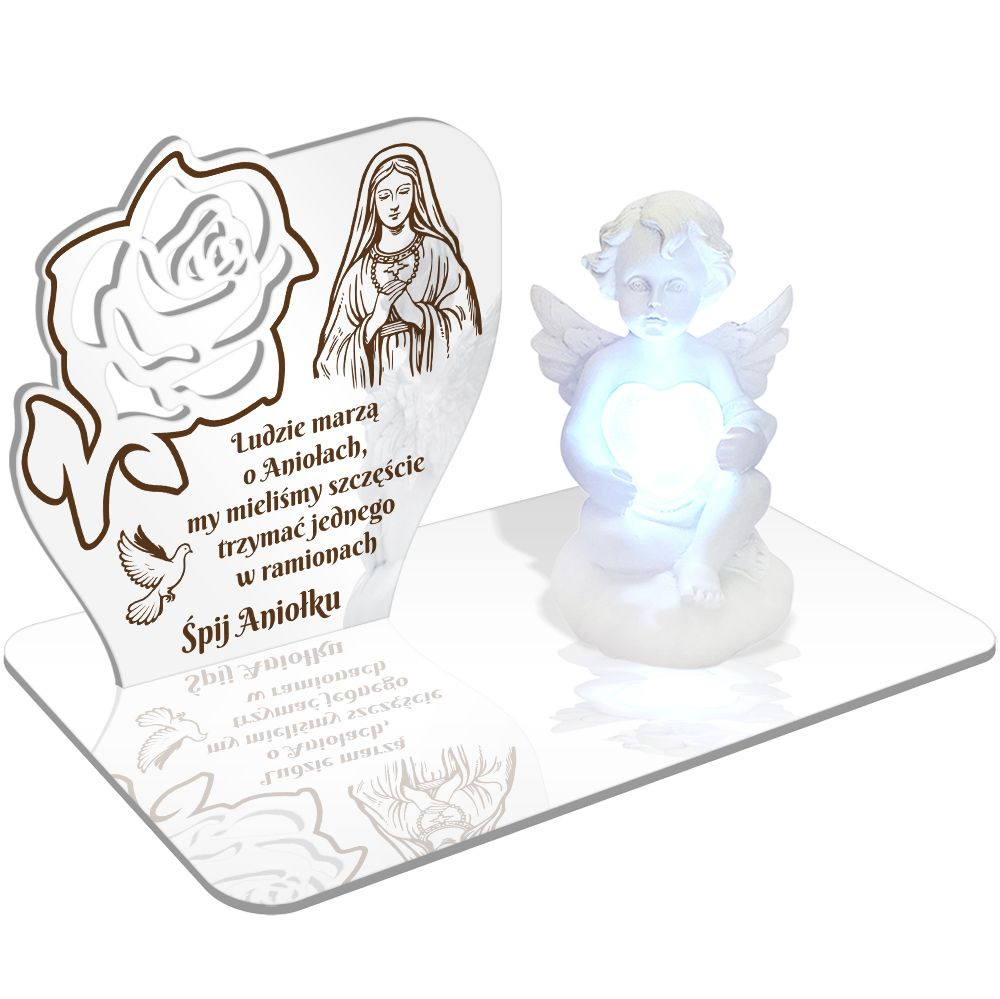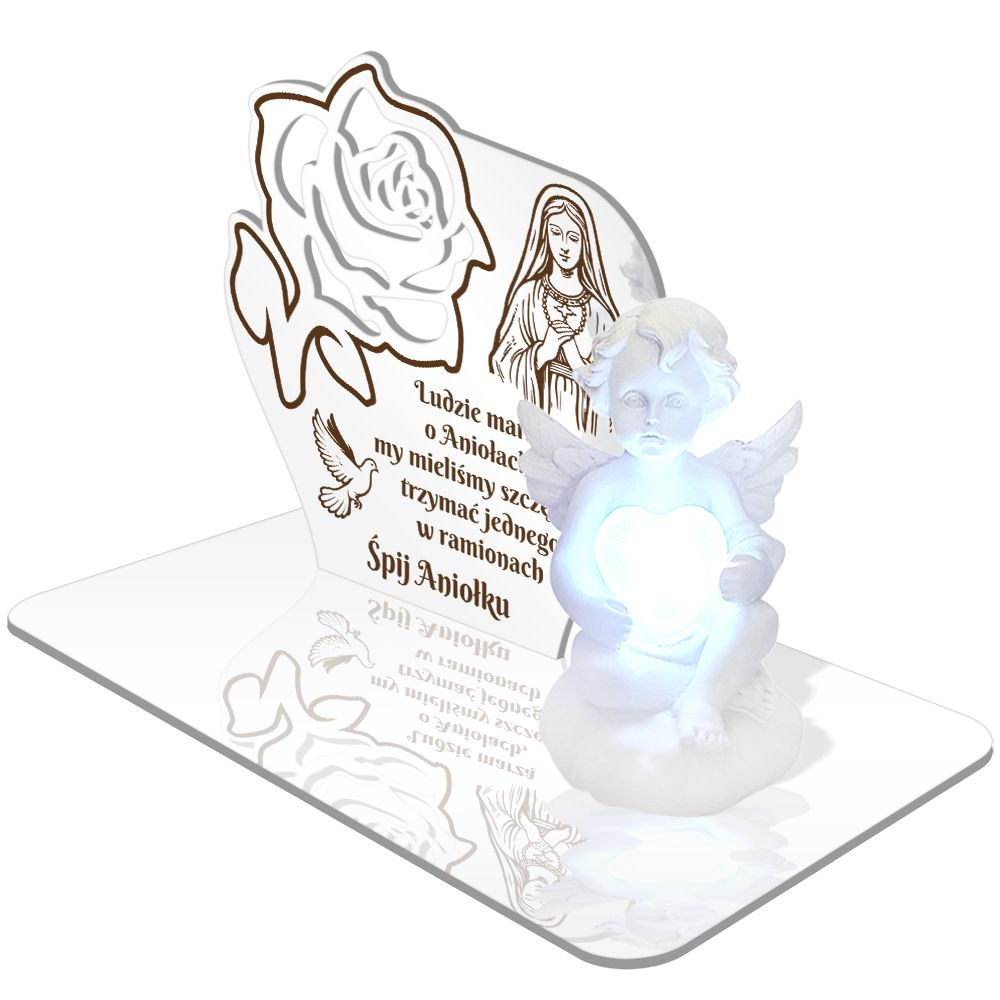 BIAŁY ZNICZ LED PREMIUM ze zdobieniem - znicz ANIOŁEK ŚWIECĄCY Z SERCEM LED