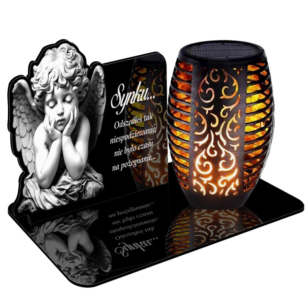 ZNICZ SOLARNY LED WIECZNY PODSTAWKA NA CMENTARZ GRÓB Anioł EFEKT PŁOMIENIA DLA SYNA