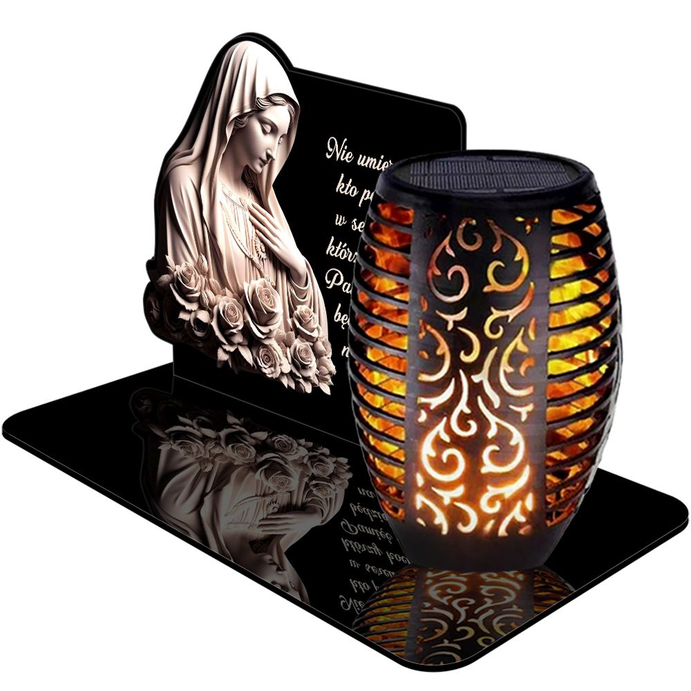 ZNICZ SOLARNY LED WIECZNY PODSTAWKA NA CMENTARZ GRÓB Maryja EFEKT PŁOMIENIA