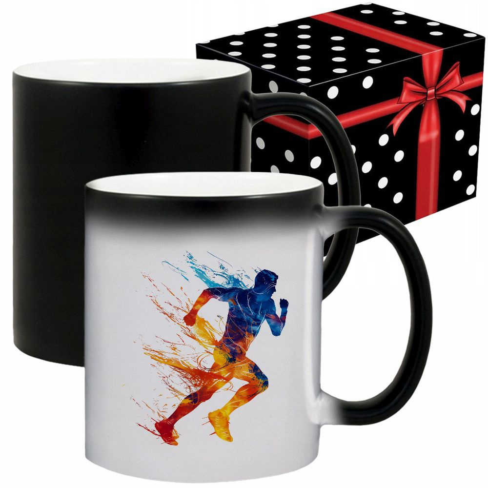 Kolor: czarny (na zimno), po zalaniu gorącym napojem pojawia się grafika, po ostygnięciu grafika znika kubek wraca do koloru czarnego.