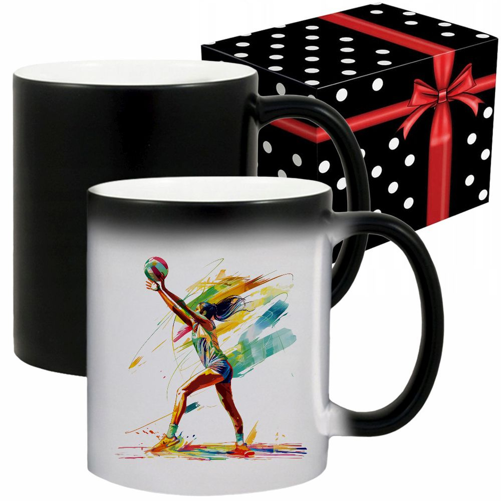 Kolor: czarny (na zimno), po zalaniu gorącym napojem pojawia się grafika, po ostygnięciu grafika znika kubek wraca do koloru czarnego.