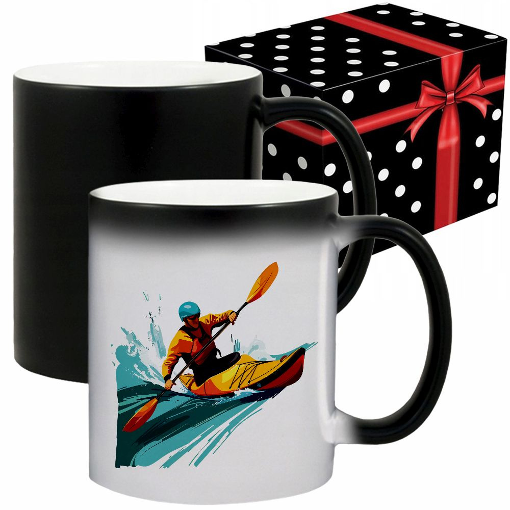 Kolor: czarny (na zimno), po zalaniu gorącym napojem pojawia się grafika, po ostygnięciu grafika znika kubek wraca do koloru czarnego.