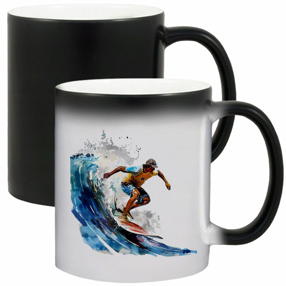 Kolor: czarny (na zimno), po zalaniu gorącym napojem pojawia się grafika, po ostygnięciu grafika znika kubek wraca do koloru czarnego.