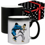 Kolor: czarny (na zimno), po zalaniu gorącym napojem pojawia się grafika, po ostygnięciu grafika znika kubek wraca do koloru czarnego.