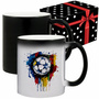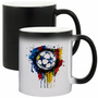 Kolor: czarny (na zimno), po zalaniu gorącym napojem pojawia się grafika, po ostygnięciu grafika znika kubek wraca do koloru czarnego.