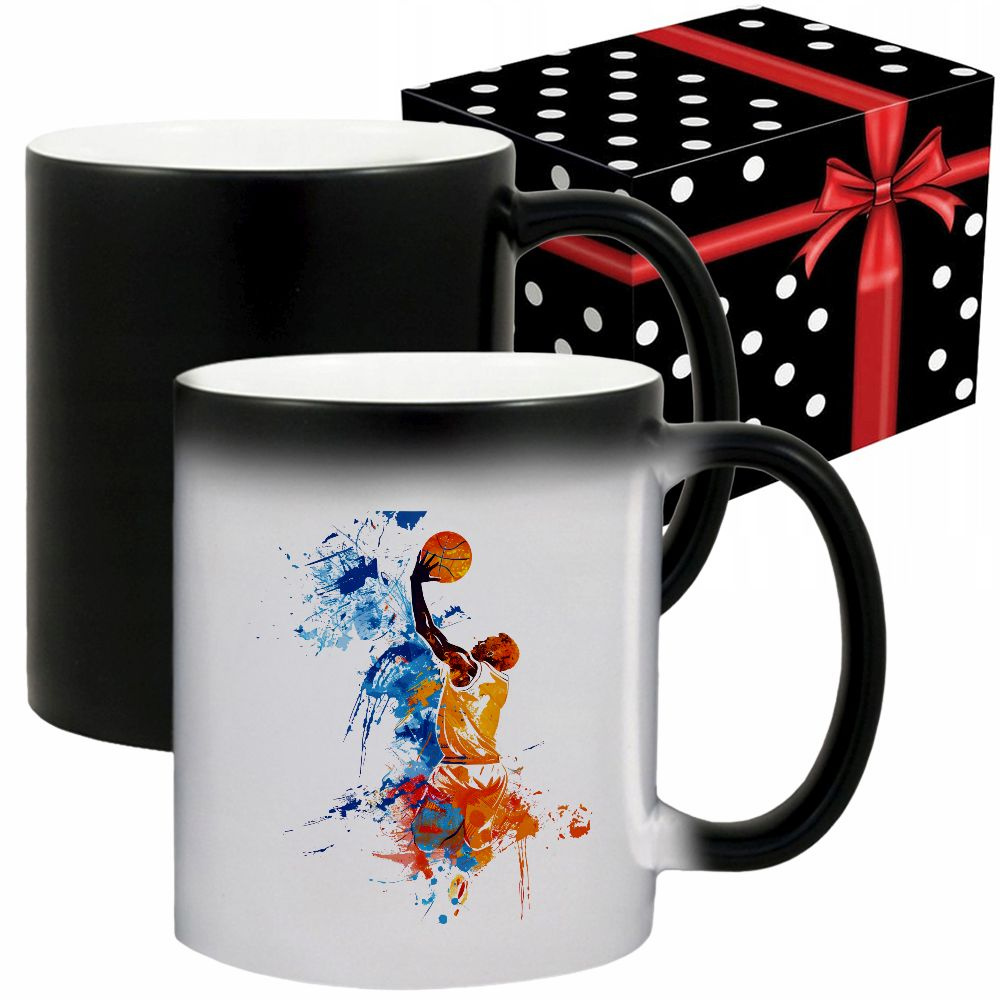 Kolor: czarny (na zimno), po zalaniu gorącym napojem pojawia się grafika, po ostygnięciu grafika znika kubek wraca do koloru czarnego.