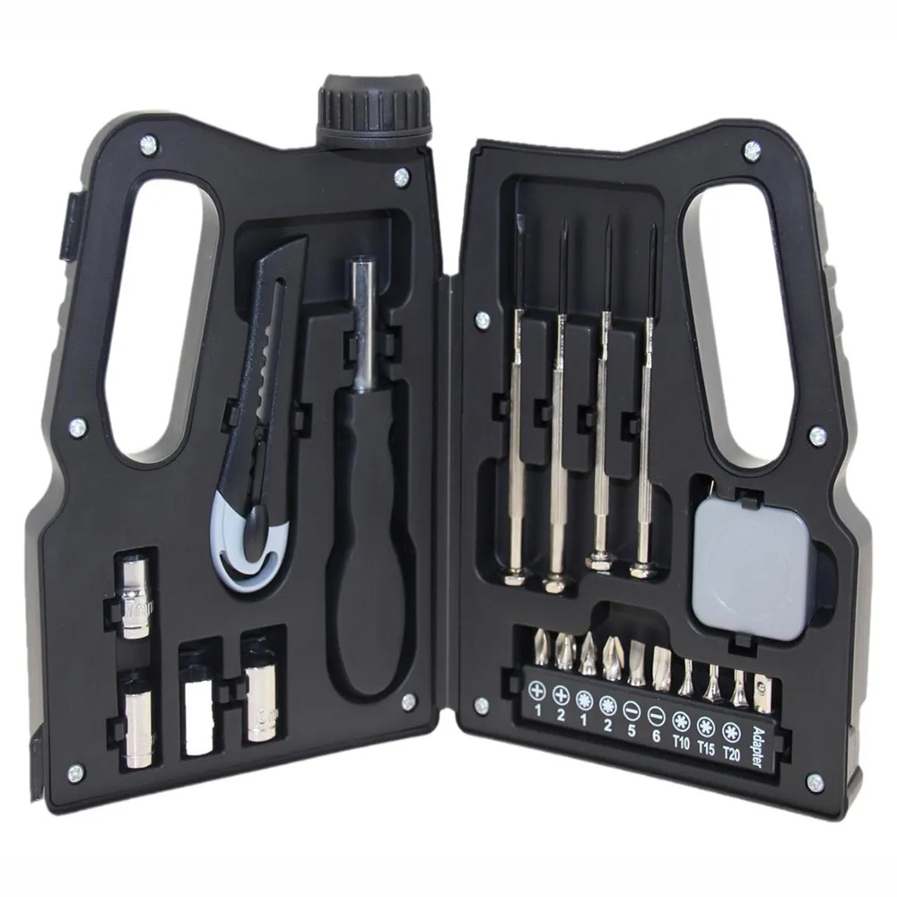 Cały zestaw składa się z 21 różnych elementów, które umieszczone są w solidnym organizerze narzędziowym w kształcie kanistra.
