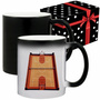 Kolor: czarny (na zimno), po zalaniu gorącym napojem pojawia się grafika, po ostygnięciu grafika znika kubek wraca do koloru czarnego.