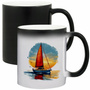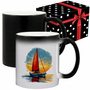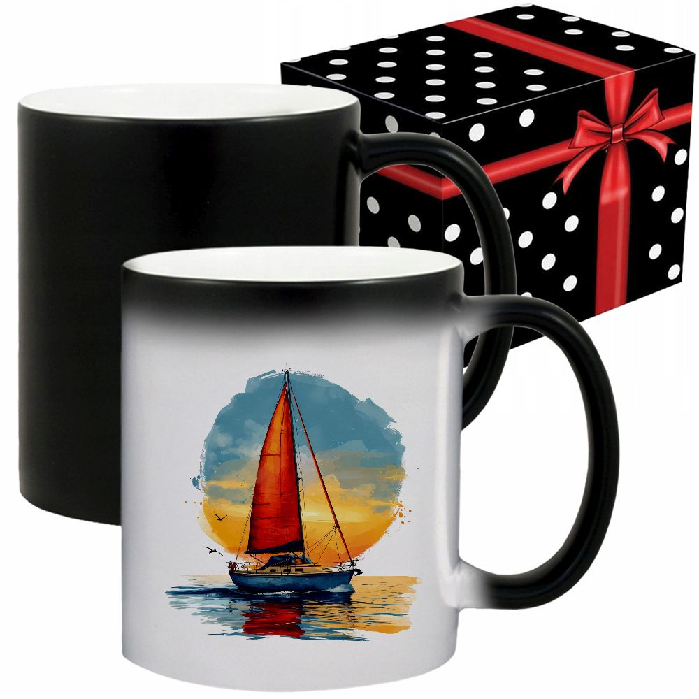 Kolor: czarny (na zimno), po zalaniu gorącym napojem pojawia się grafika, po ostygnięciu grafika znika kubek wraca do koloru czarnego.