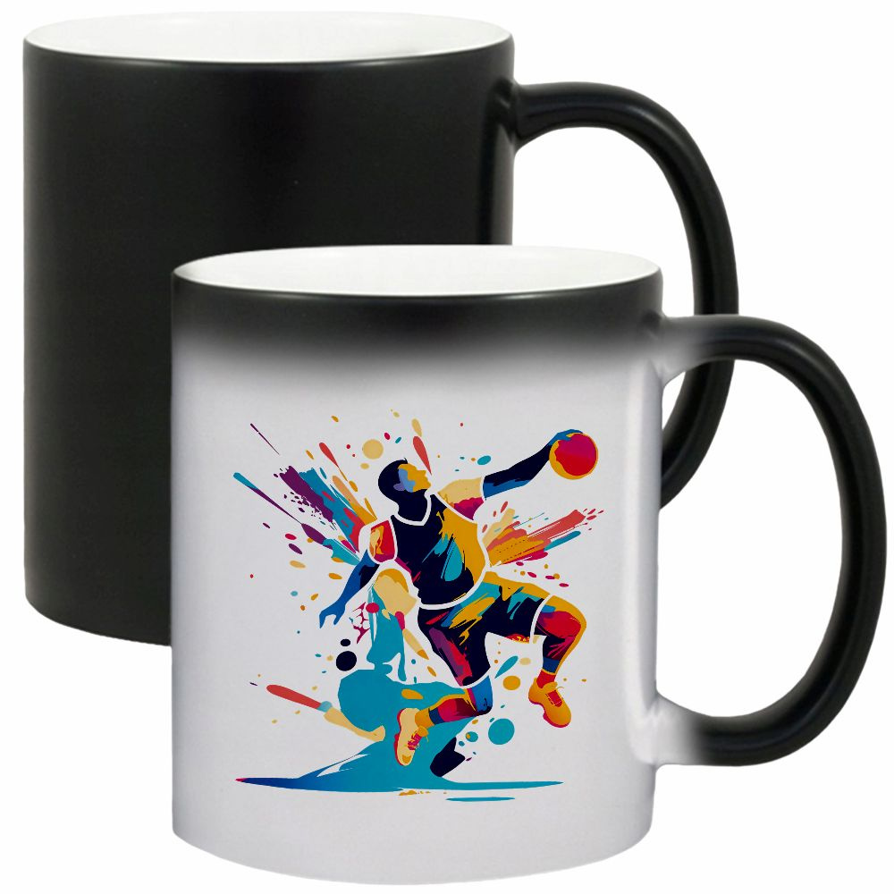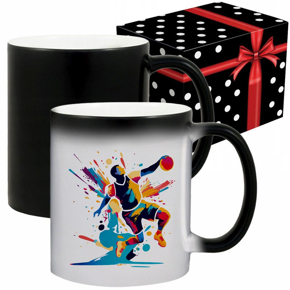 Kolor: czarny (na zimno), po zalaniu gorącym napojem pojawia się grafika, po ostygnięciu grafika znika kubek wraca do koloru czarnego.