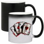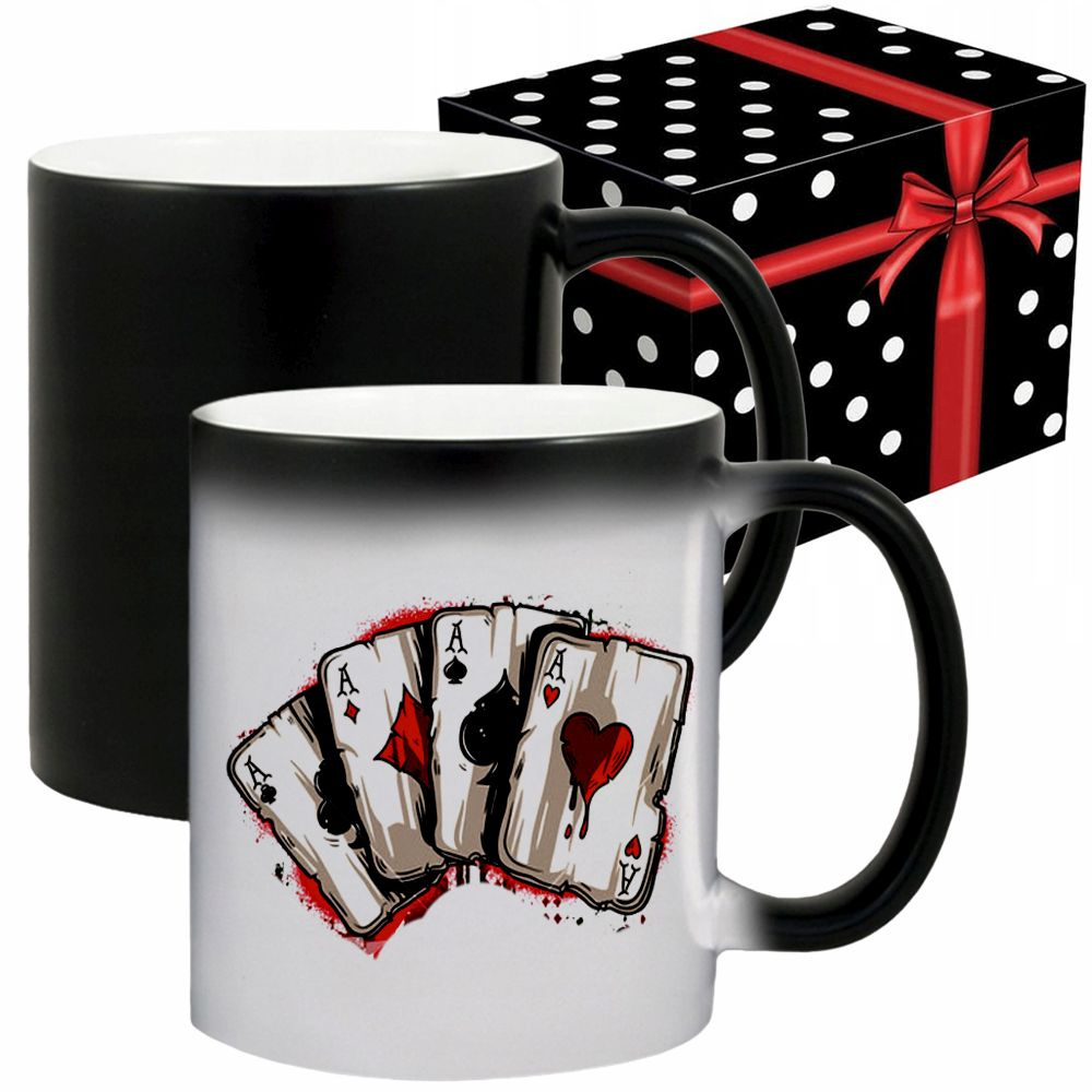 Kolor: czarny (na zimno), po zalaniu gorącym napojem pojawia się grafika, po ostygnięciu grafika znika kubek wraca do koloru czarnego.
