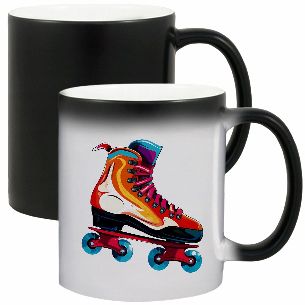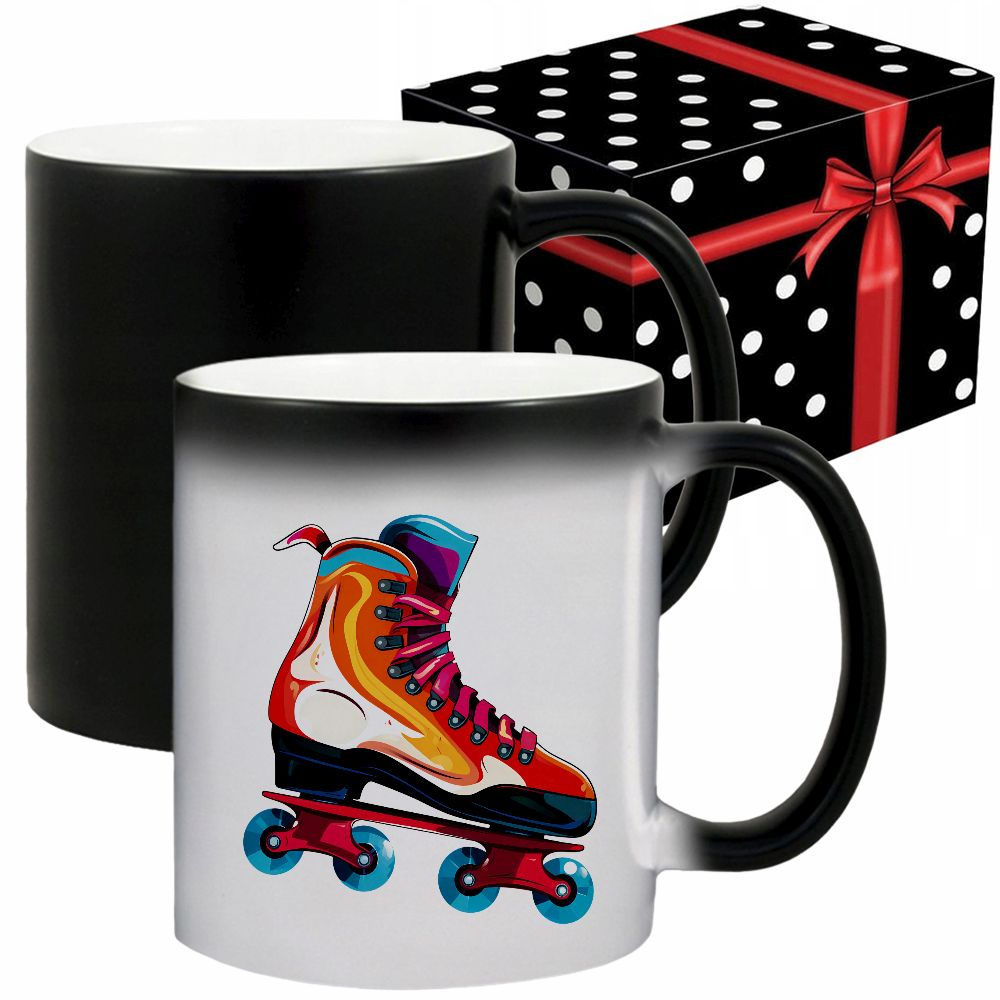 Kolor: czarny (na zimno), po zalaniu gorącym napojem pojawia się grafika, po ostygnięciu grafika znika kubek wraca do koloru czarnego.