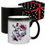 Kolor: czarny (na zimno), po zalaniu gorącym napojem pojawia się grafika, po ostygnięciu grafika znika kubek wraca do koloru czarnego.