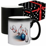 Kolor: czarny (na zimno), po zalaniu gorącym napojem pojawia się grafika, po ostygnięciu grafika znika kubek wraca do koloru czarnego.