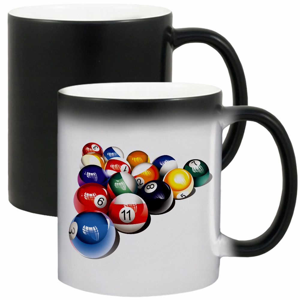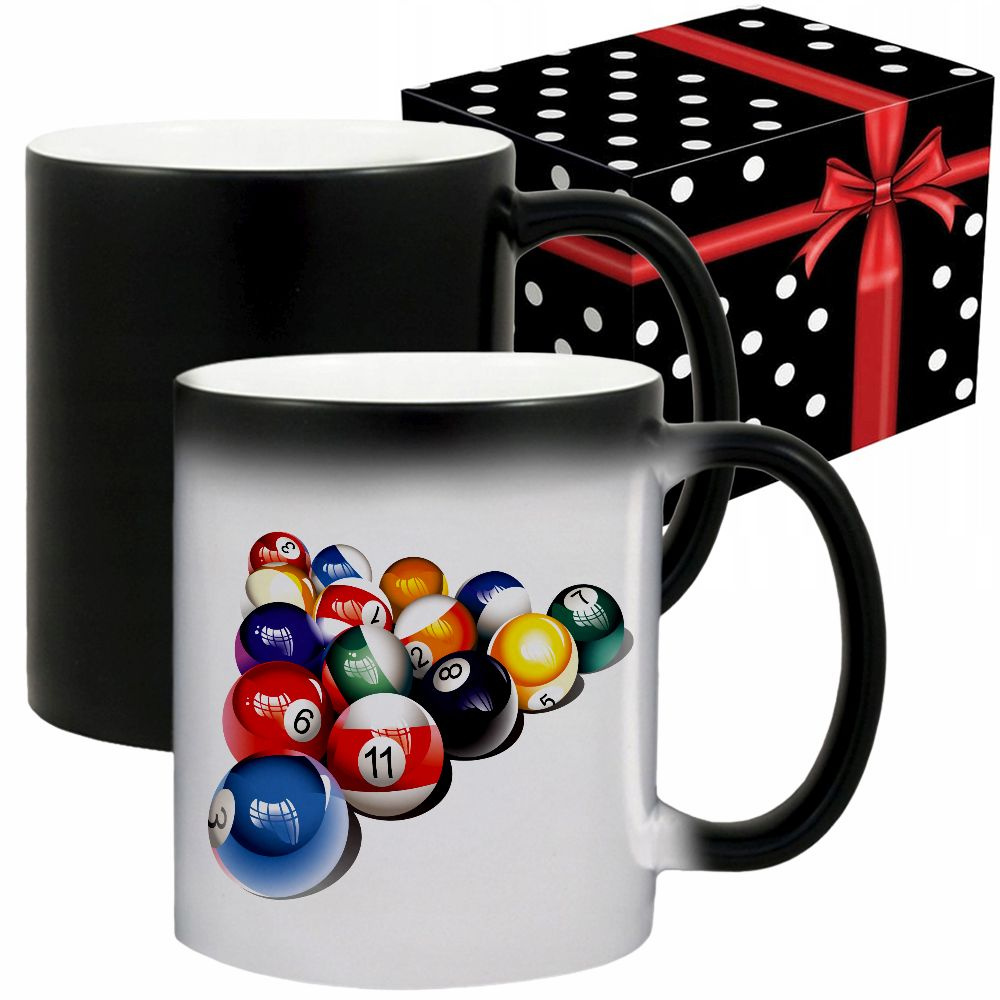 Kolor: czarny (na zimno), po zalaniu gorącym napojem pojawia się grafika, po ostygnięciu grafika znika kubek wraca do koloru czarnego.