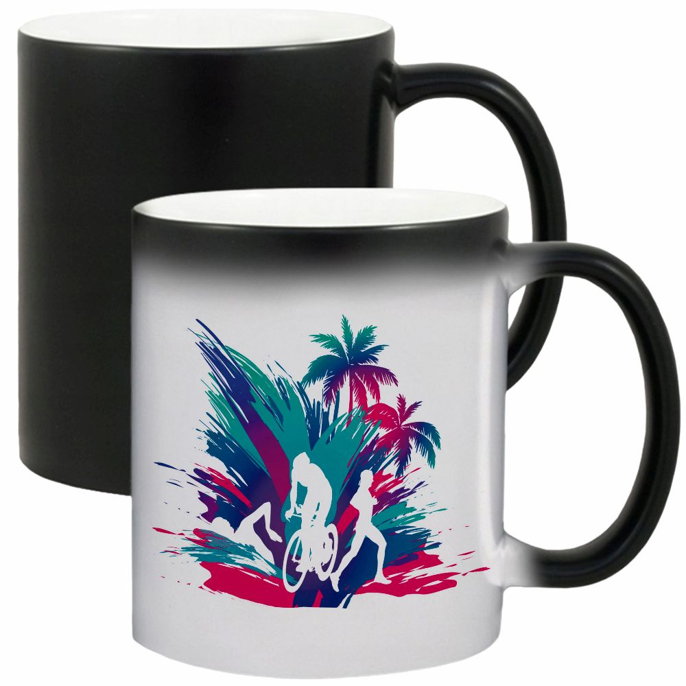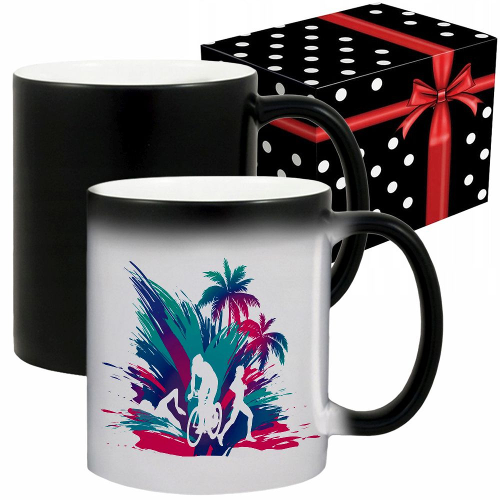 Kolor: czarny (na zimno), po zalaniu gorącym napojem pojawia się grafika, po ostygnięciu grafika znika kubek wraca do koloru czarnego.