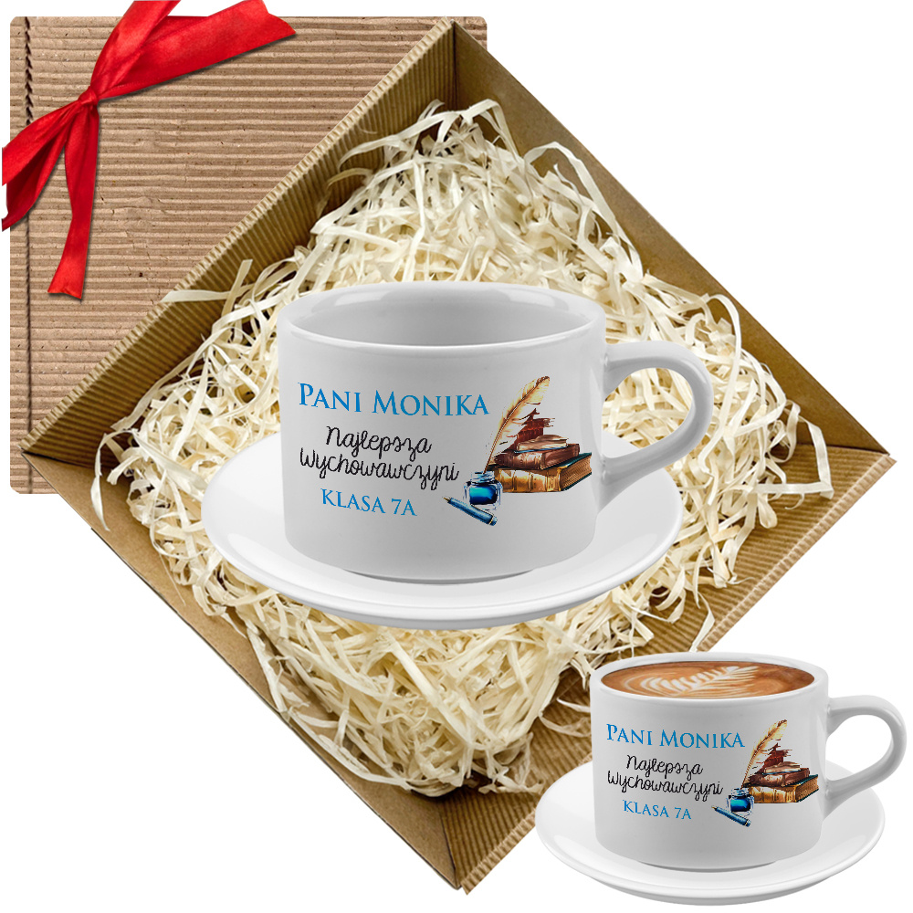 Biała personalizowana filiżanka z talerzykiem na Dzień Nauczyciela– Idealny prezent
