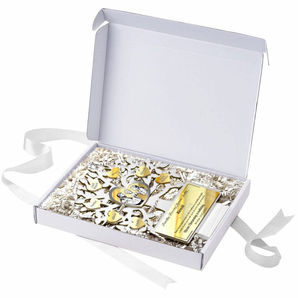 - Upominek jest zapakowany w eleganckie białe pudełko ze wstążką.