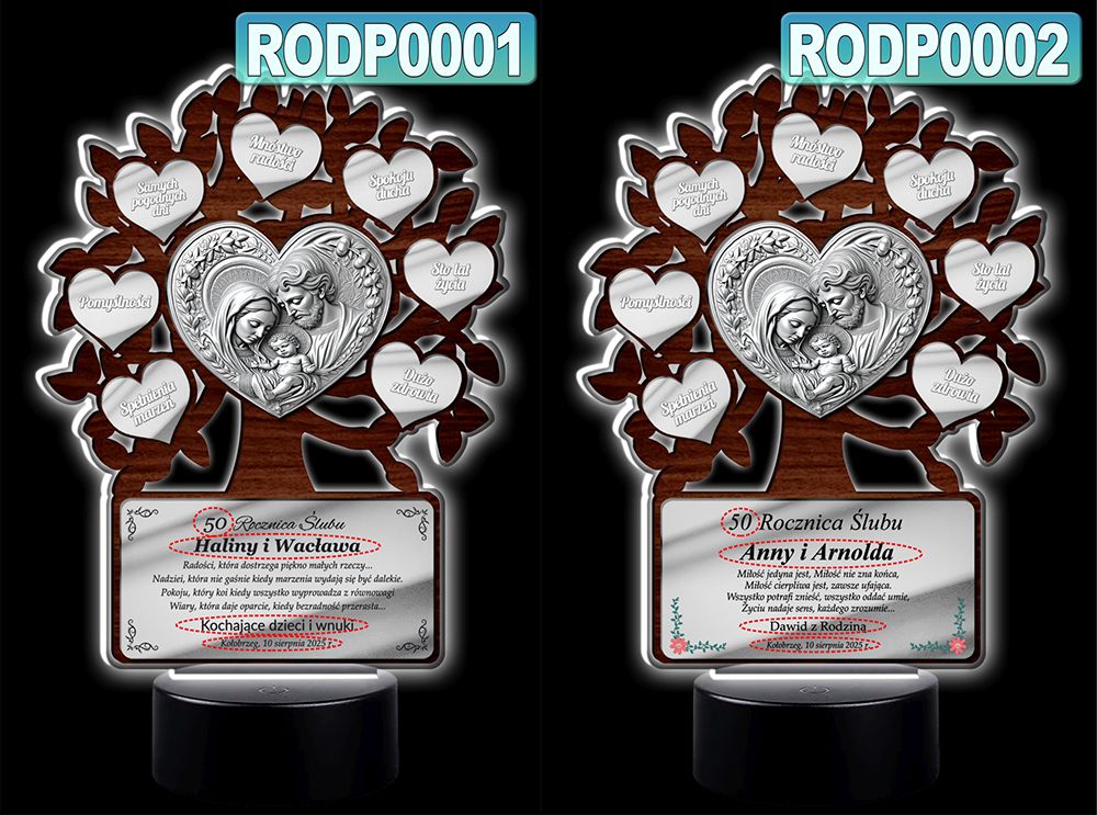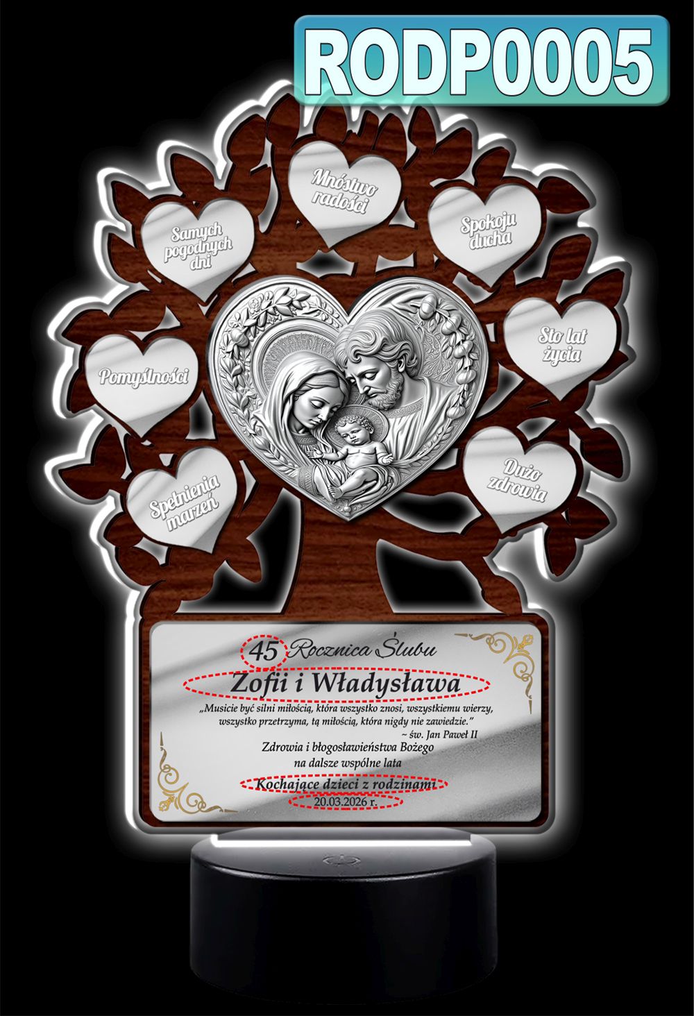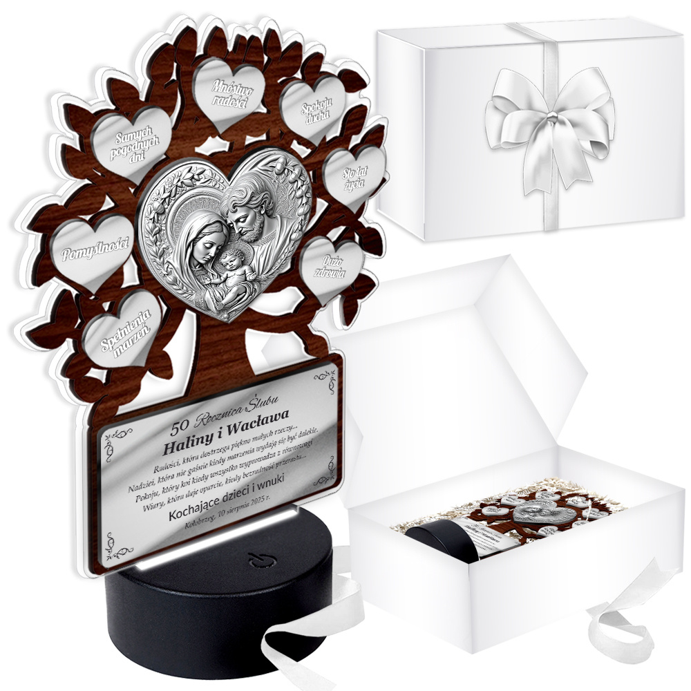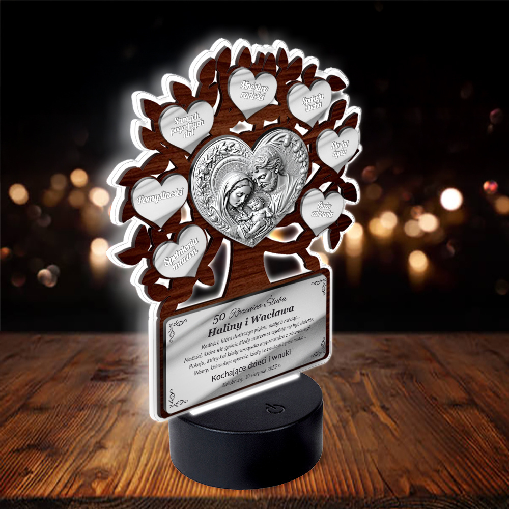 Podświetlany obrazek LED - Drzewko Szczęścia z obrazkiem Świętej Rodziny – prezent jubileuszowy z personalizacją