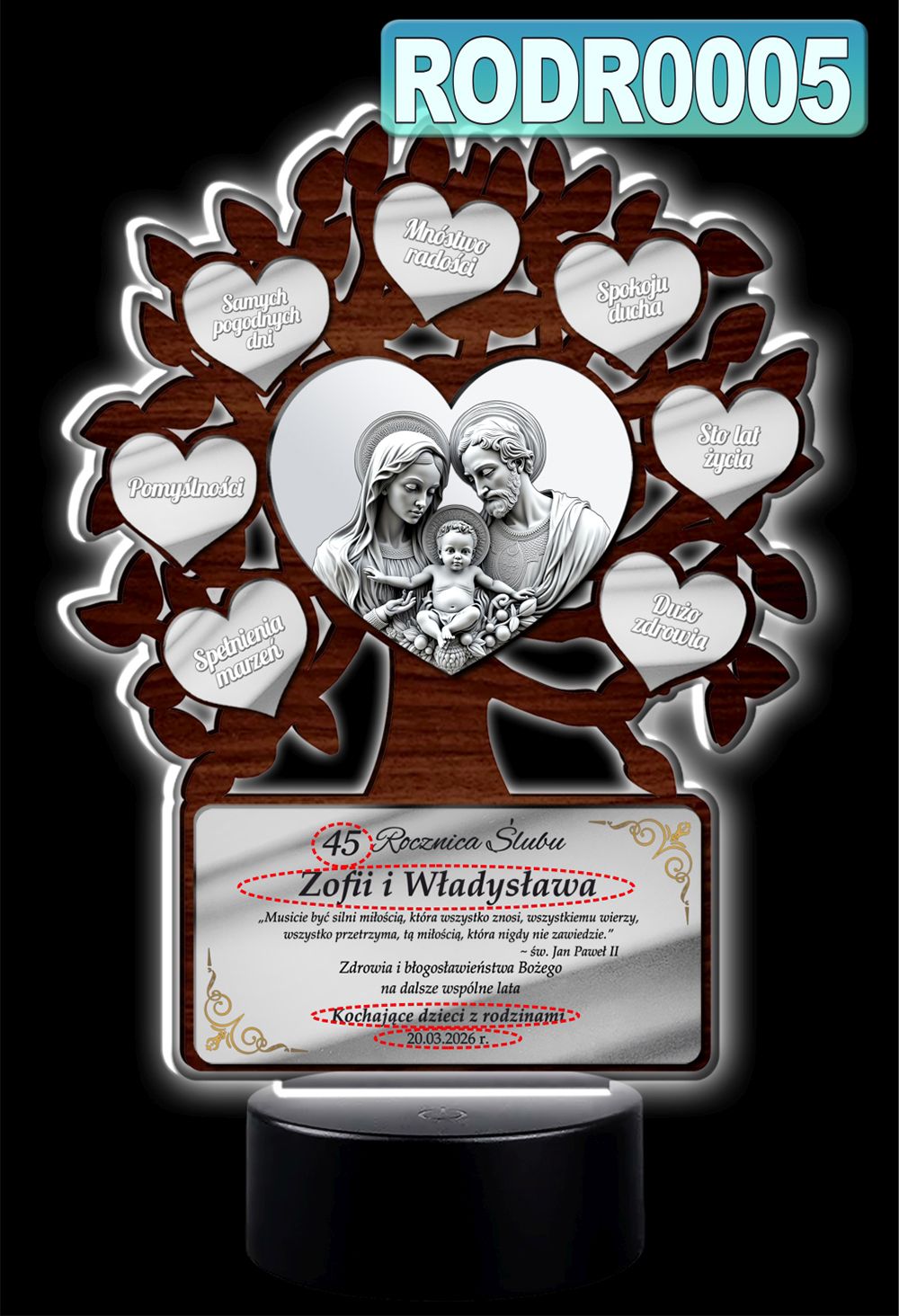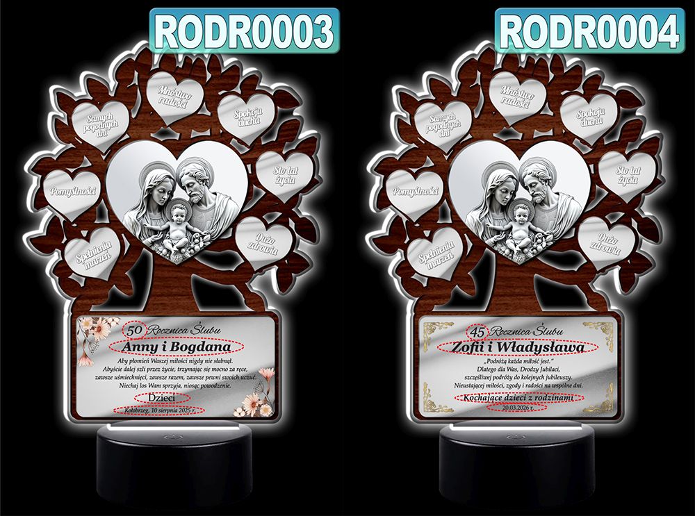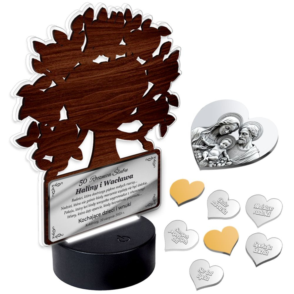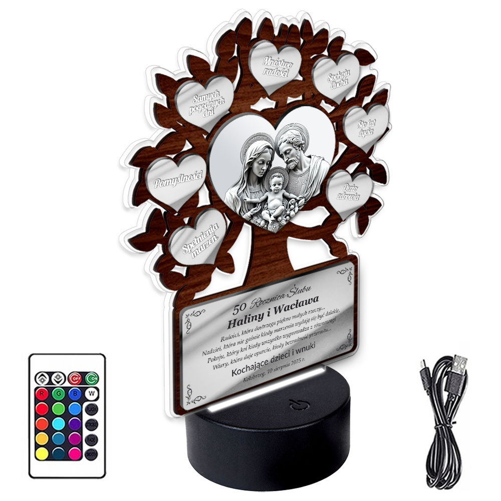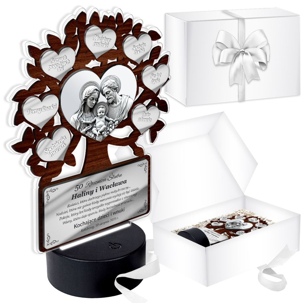 Podświetlany obrazek LED - Drzewko Szczęścia z obrazkiem Świętej Rodziny – prezent jubileuszowy z personalizacją