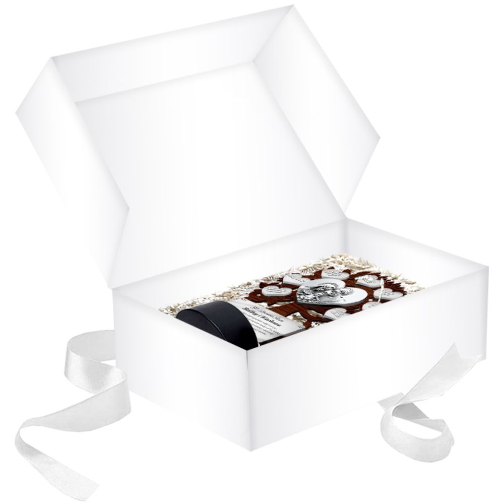 - Upominek jest zapakowany w eleganckie pudełko z ozdobnym wypełniaczem
