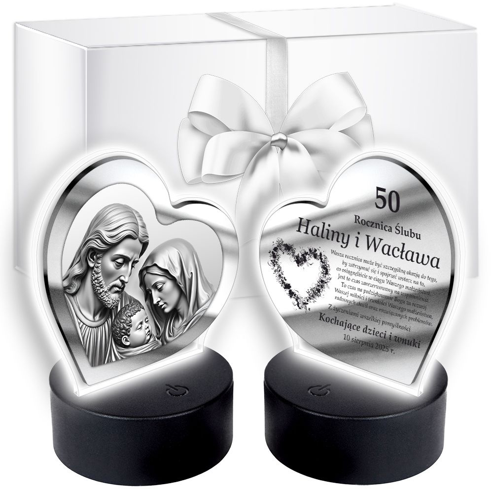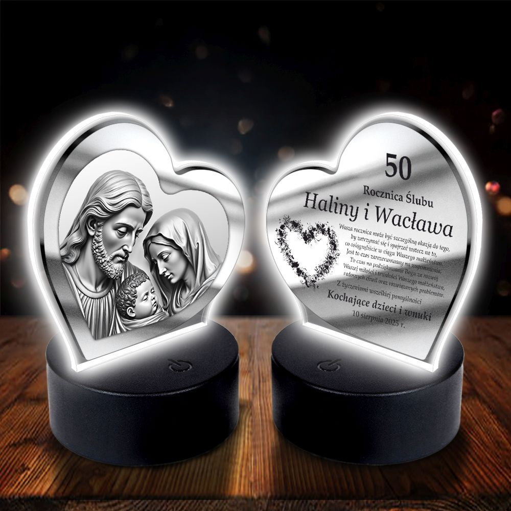 Wyjątkowa pamiątka z okazji Rocznicy Ślubu – podświetlany obrazek w kształcie serca z grafiką przedstawiającą Świętą Rodzinę