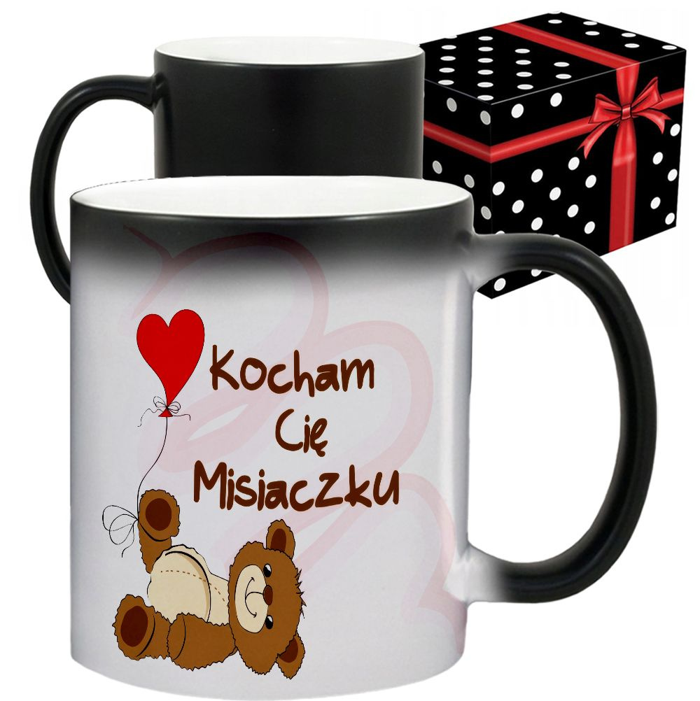 • Kolor: czarny (na zimno), po zalaniu gorącym napojem pojawia się grafika, po ostygnięciu grafika znika kubek wraca do koloru czarnego.